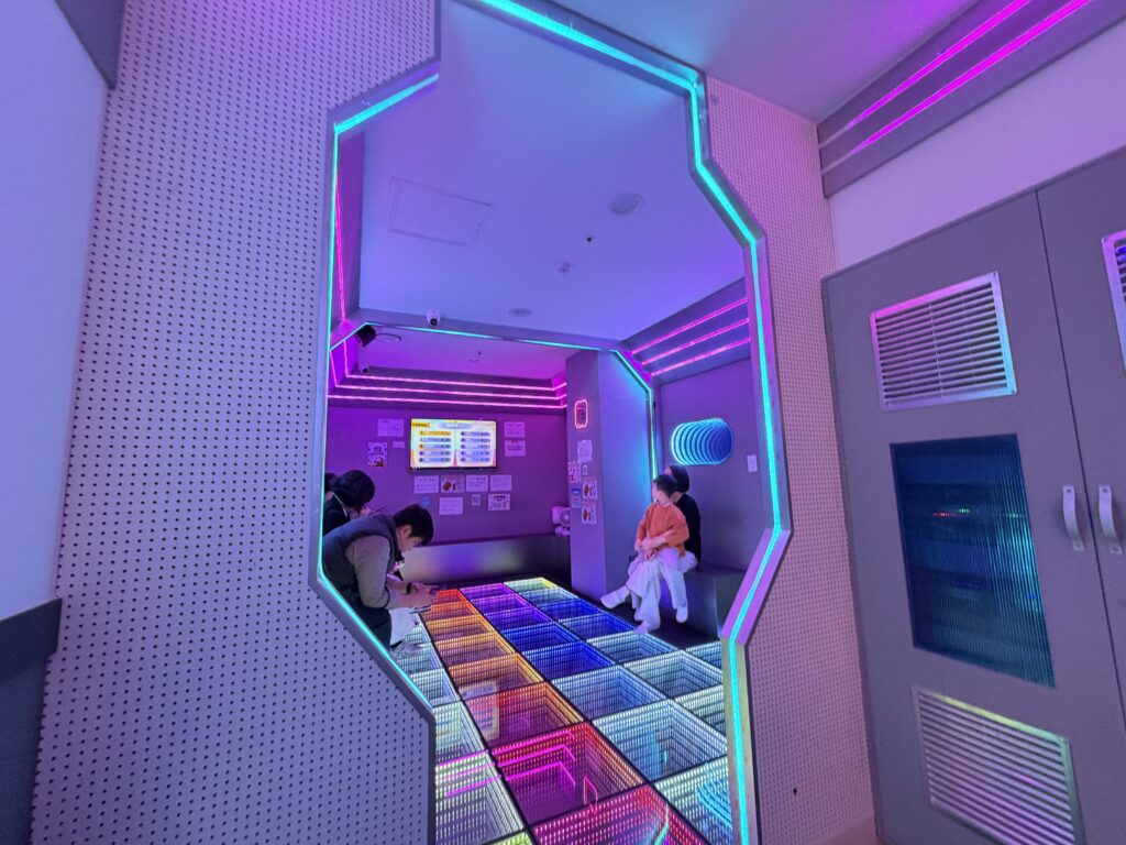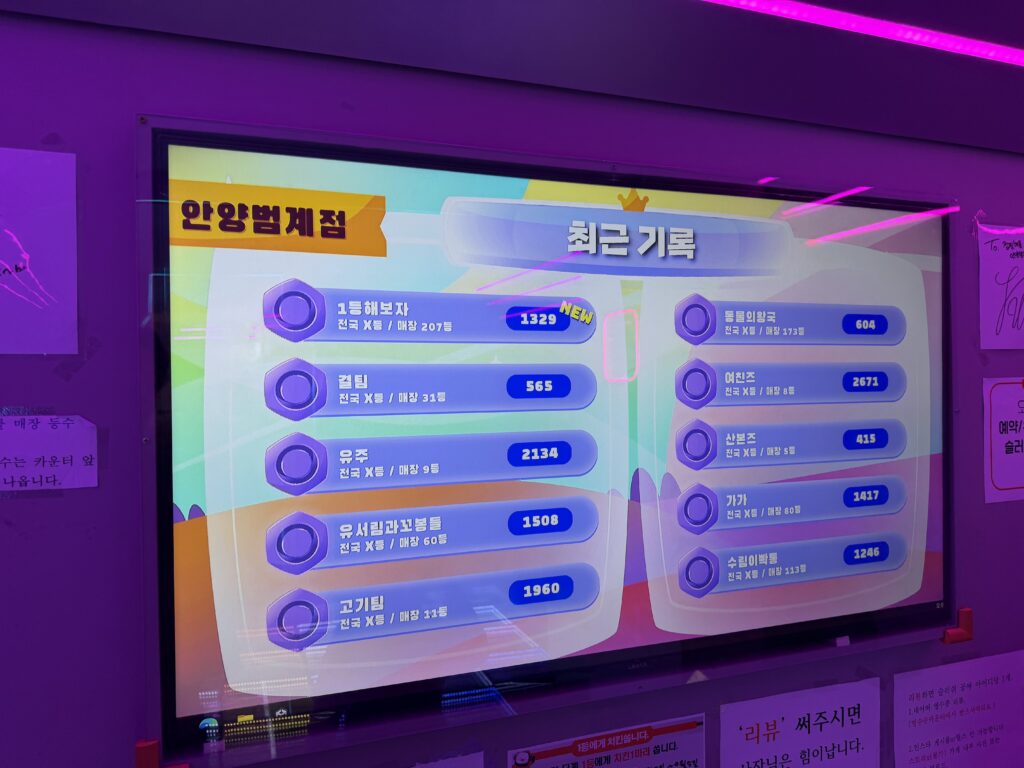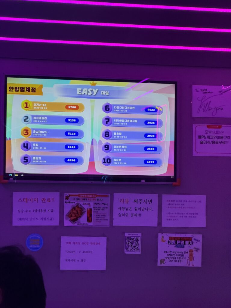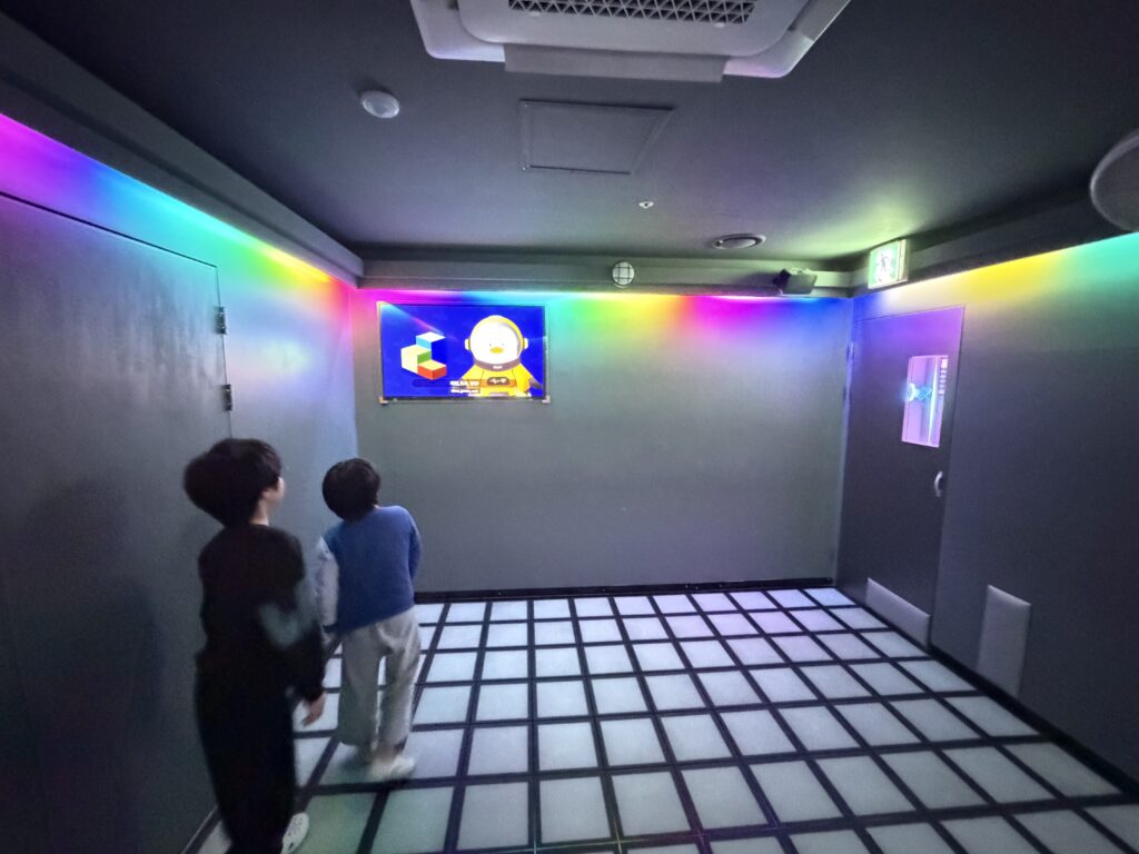 인스타나 유튜브에서만 보던 바닥이 알록달록 버튼으로 되어 있는 방안에서 반짝이는 블럭들이 방을 휘저으며 다니는데, 게임 규칙 자체가 빨간색을 밟으면 라이프가 하나씩 깎인단다. (라이프 총 5개) 그렇게 라이프가 모두 소모가 되면 해당 스테이지가 다시 시작되는데 이렇게 계속 스테이지를 깨다보면 점수가 쌓일거고, 쌓인 점수를 가지고 매장/전국 기록이 나온다. 우리는 처음이라 그런지 처음에 너무 방심했었고 그렇게 감을 익히기 전까지 스테이지를 계속 반복해서 성적이 그리 좋지 않았다. (오늘 매장에서 꼴등일듯;;) 여튼! 그렇게 15분동안 30년전 펌프를 하듯이 발을 막 굴리니까 땀도 많이 나고 운동도 조금은 된 것 같아 기분이 좋았달까. 온몸이 땀으로 범벅이 되고 다리는 후들거렸지만, 아이들과 함께 이렇게 실컷 웃고 뛰어논 게 얼마 만인가 싶어 정말 행복했다. 아이들도 평소보다 훨씬 에너지를 많이 쓴 덕분인지, 얼굴에는 홍조가 가득했지만 그 어느 때보다 해맑은 미소를 짓고 있었다. 가끔 이렇게 온 가족이 함께 몸을 움직이면서 노는 것도 정말 좋은 것 같다. 다음엔 와이프도 같이 와서 다 같이 뛰어놀면 더 재미있을 것 같다는 생각이 들었다.
