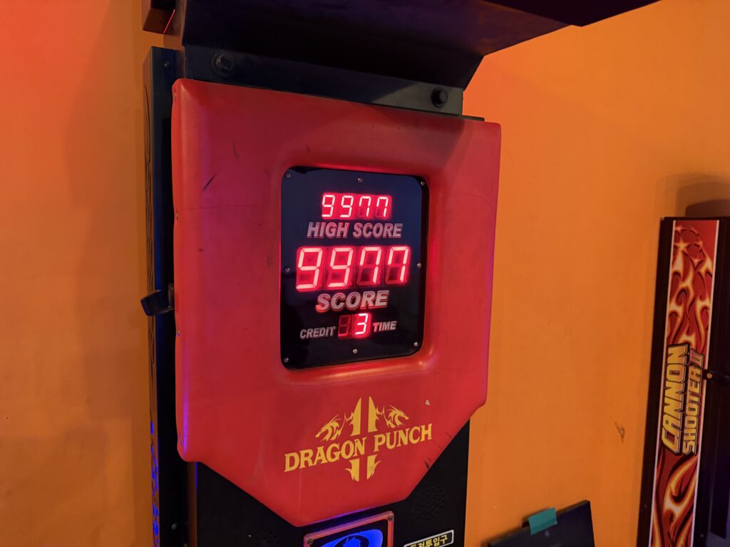 집에 바로 가기에는 아쉬워 근처 오락실에 들러 아이들과 인형뽑기로 조그마한 키링 두개 뽑고, 둘째가 펀치기계를 치고 싶다고 해서 몇 판 해봤다. 역시 아이들은 아직 제대로 치는건 어려웠고 난 최고 신기록을 세웠지..롱..ㅋㅋ